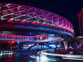 環(huán)形人行天在設(shè)計(jì)方案上,大膽創(chuàng)新,極富現(xiàn)代感。上部采用鋼箱梁結(jié)構(gòu),很大跨徑36.8米,橋面寬5米,在四個(gè)拐角共設(shè)8個(gè)梯道,特別是在“環(huán)”形主橋上加設(shè)頂棚,不僅造型優(yōu)美,而且遮陽(yáng)避雨,突出了人性化功能設(shè)計(jì)。